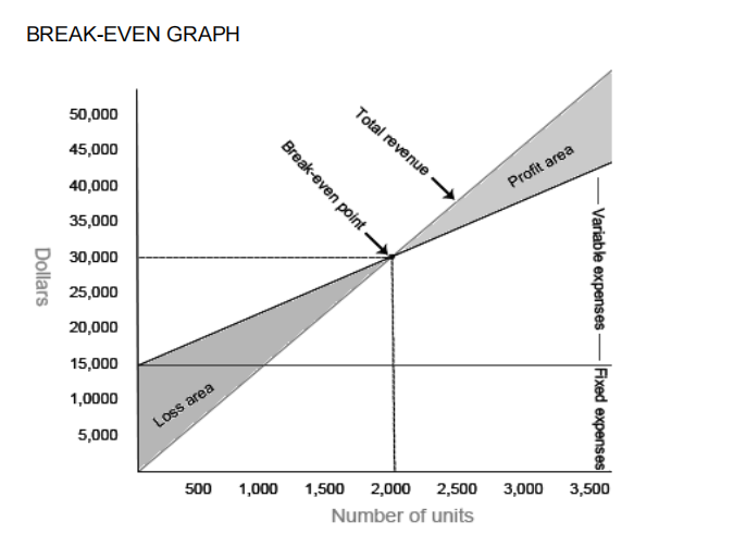 2.1.9 Break-even units: The value on the X-axis directly below the intersection (The quantity needed to cover all costs).