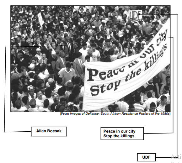 | SOURCE 1C The source below has been taken from a newspaper article published in The Washington Post on 14 September 1989. It outlines the events that unfolded during the peace march organised by the Mass Democratic Movement (MDM) in Cape Town on 13 September 1989. More than 20 000 anti-government protesters of all races filled Cape Town’s main thoroughfare today in a ‘march for peace’ that civil rights leaders said demonstrated the needlessness (uselessness) of emergency decrees (laws) normally prohibiting such expressions of political dissent (conflict). The demonstration, which took place without incident, was one of the largest ever held in South Africa and the only one in recent years to receive an official government waiver (surrender) of more than a dozen emergency regulations under which it could have been banned in advance or forcibly broken up. The Rev. Allan Boesak, who with Anglican Archbishop Desmond Tutu led the mile-long procession, vowed to cheering supporters at the City Hall to continue the anti-apartheid movement’s six-week campaign of defiance ‘as long as our people are not allowed to vote in a government of our choice’. Today, a human tide of black, white and ‘Colored’, or mixed-race, protesters moved down the city’s broad Adderley Street, singing ‘We Shall Overcome’ and other freedom songs in an outpouring (burst) reminiscent (famous) of the US Civil Rights Movement in the 1960s. Marchers carried the banner of the outlawed African National Congress and other emblems of revolution and openly called for the overthrow of the government and scoffed (mocked) at the myriad (many) laws against political dissent (disagreement) that, at any other time in the past three years, would almost certainly have invited harsh intervention by the police. … Tutu, wearing lavender (purple) robes and beaming at the crowd, said, ‘Today is a day on which we, the people, have scored a great victory for justice and peace.’ |