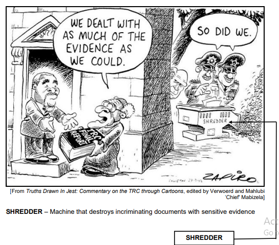 Source 2B also illustrates the issue of evidence destruction by showing former South African President F.W. de Klerk and members of the security forces using a shredding machine, which hindered the TRC’s capacity to gather comprehensive information on human rights abuses. This detail aligns with Source 2C, which mentions the failure of several trials due to insufficient evidence, allowing many former security forces to escape accountability. Together, these sources reveal that the TRC’s effectiveness was curtailed not only by its limited mandate but also by external factors, such as destroyed records, that obstructed justice for numerous victims.