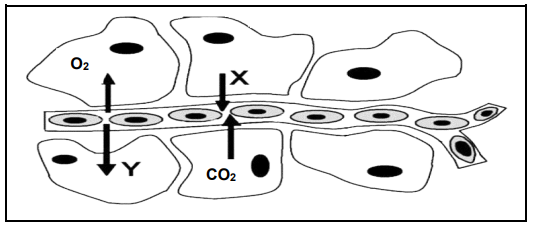 In the diagram below, identify the process occurring at X and Y between bodily tissue cells and a capillary.