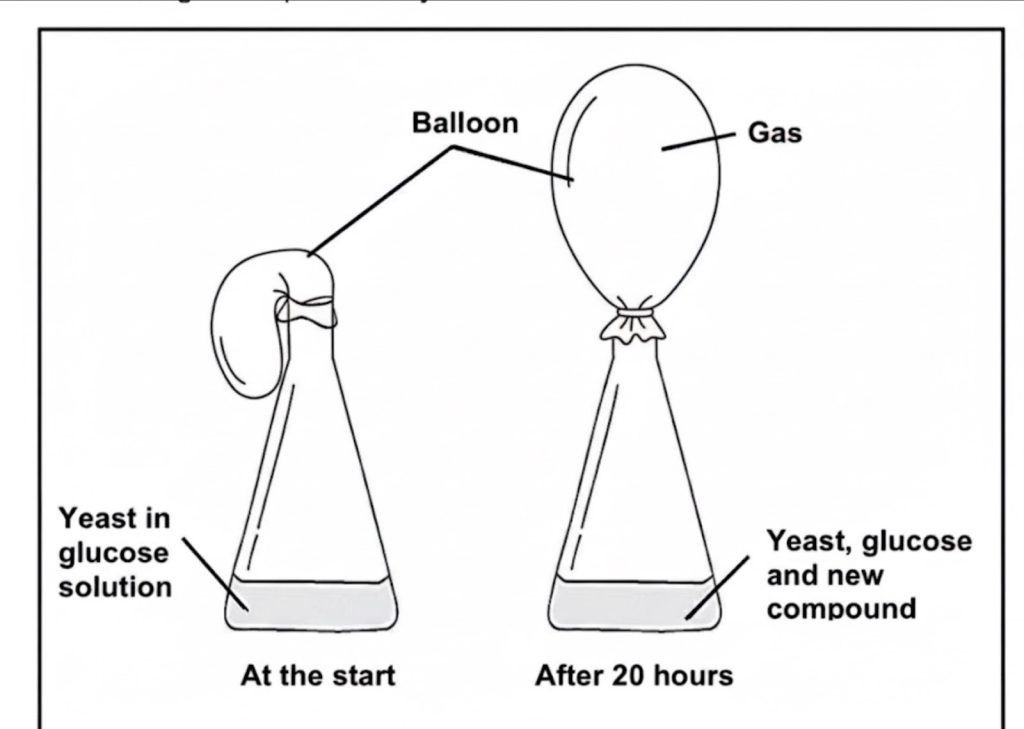 In anaerobic respiration, yeast converts glucose to alcohol and releases carbon dioxide, causing the balloon to expand.
