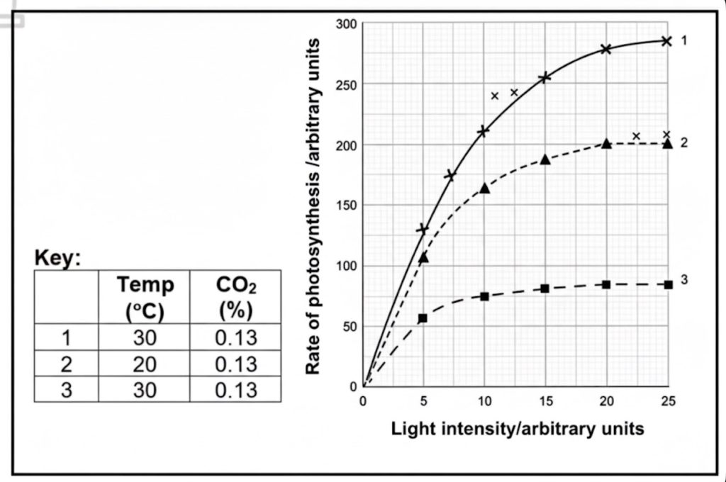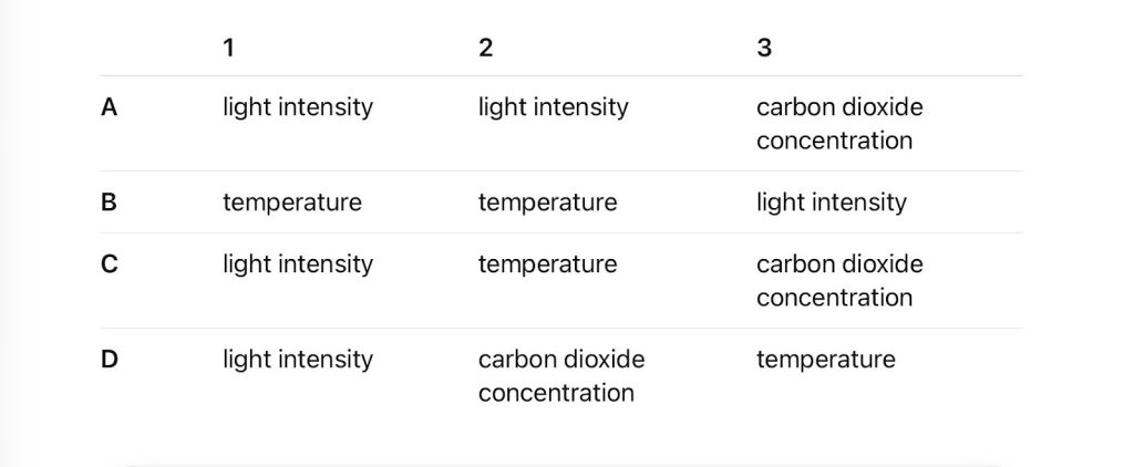 The limiting factors for the rate of photosynthesis are identified by observing where the graph begins to level off, showing that light intensity is no longer limiting. In Experiment 2, the rate reaches a lower maximum than in Experiment 1 because the temperature is set at 20°C, so temperature is the limiting factor. In Experiment 3, which corresponds to Option C, the rate reaches the lowest maximum of all the experiments. This happens because the carbon dioxide concentration is kept very low, and the shortage of CO₂ prevents the photosynthesis rate from rising any further. Therefore, for Option C, carbon dioxide concentration becomes the limiting factor.