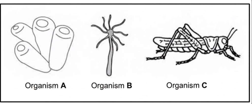 Animals with a mesoderm are triploblastic. Arthropods (Organism C) possess a mesoderm, while Porifera (A) and Cnidaria (B) do not.