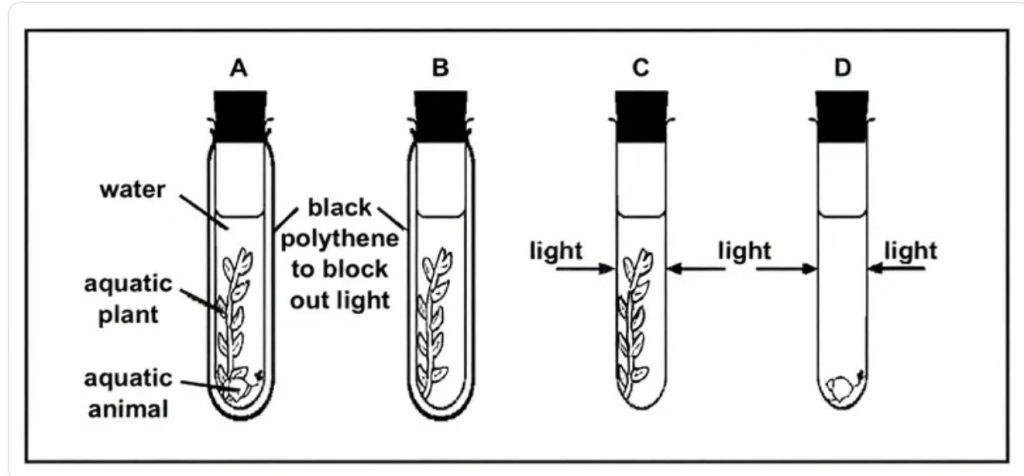 The carbon dioxide concentration will decrease in test-tube C. This is because test-tube C contains both an aquatic plant and an animal exposed to light. In the presence of light, the plant carries out photosynthesis, a process that actively uses carbon dioxide from the water. Although both the plant and the animal also respire and release some CO₂, the plant’s rate of CO₂ uptake during photosynthesis is greater than the total CO₂ released through respiration. As a result, there is a net reduction in carbon dioxide in test-tube C.