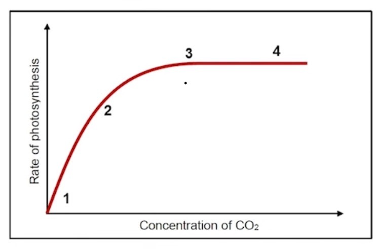 Between points 1 and 2 the curve rises steeply, showing the fastest increase in the rate of photosynthesis as carbon dioxide concentration begins to rise.
