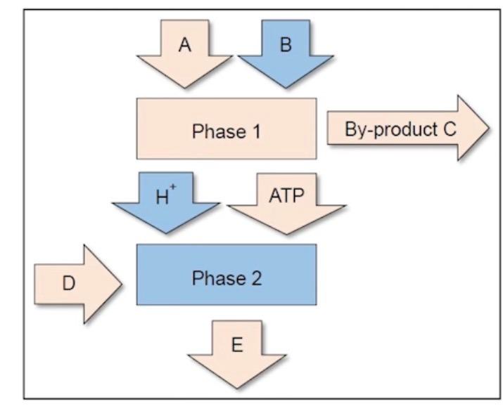 The materials labelled A and B represent light and water, which are both essential for the light phase. Light provides the energy that chlorophyll needs to drive the reactions, while water is split to release hydrogen and oxygen. These two raw materials work together to power the early steps of photosynthesis and prepare the plant for glucose production in the next phase.
