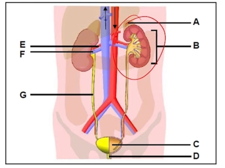 E is the renal artery, and it brings oxygenated, unfiltered blood to the kidney. This blood contains waste products and excess substances that need to be removed through filtration. The kidney then processes this blood to maintain the body’s fluid, electrolyte balance, and remove toxins.