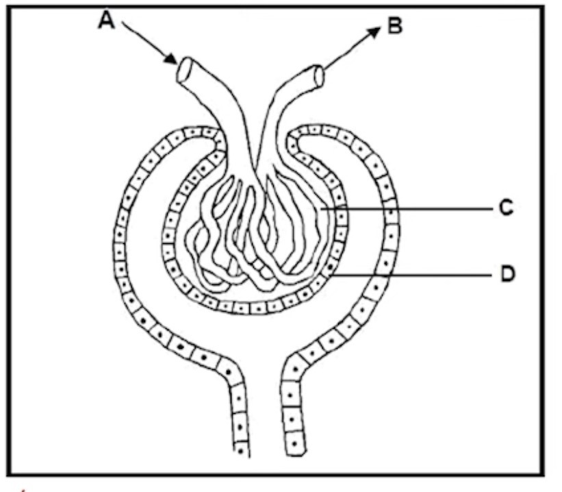Part C has walls made of a single, very thin layer of cells, which makes it easy for small substances to move from the blood into the capsule. Because this barrier is so thin, filtration happens quickly and efficiently as useful and waste substances can pass through with little resistance.