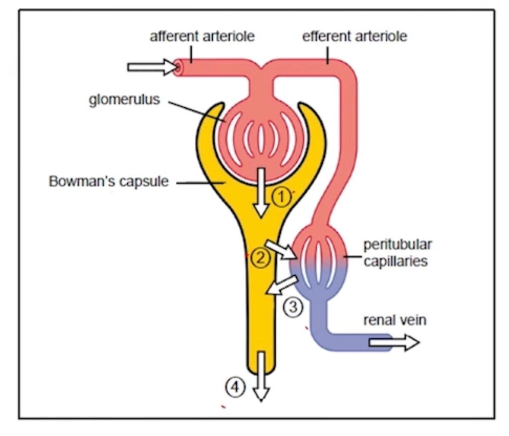 The process that occurs in this structure is glomerular ultrafiltration. During this process, high-pressure blood enters the glomerulus and forces water, salts, glucose, amino acids and urea out of the blood and into Bowman’s capsule. This forms the initial filtrate that will later be modified to produce urine.